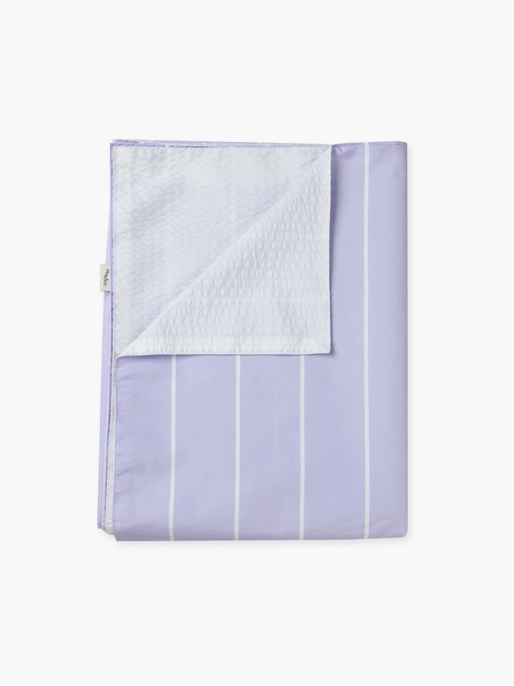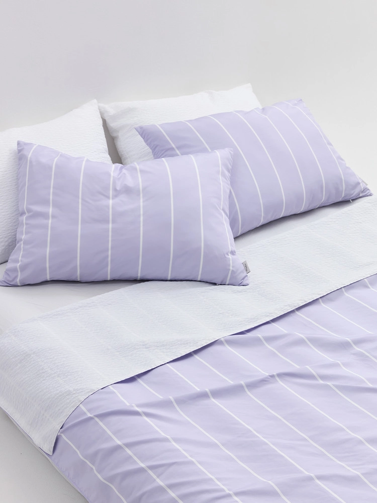 하이틴 무드 영감을 받아 빈티지한 퍼플 스트라이프 패턴을 제작하였습니다. 베딩만으로도 은은한 인테리어 포인트가 됩니다. 뒷면에 시어서커 원단을 사용하여 한 여름 쾌적한 수면환경을 제공합니다. 원단이 갖고 있는 선명한 프린팅은 이쁜 색감을 더 돋보이게 합니다.